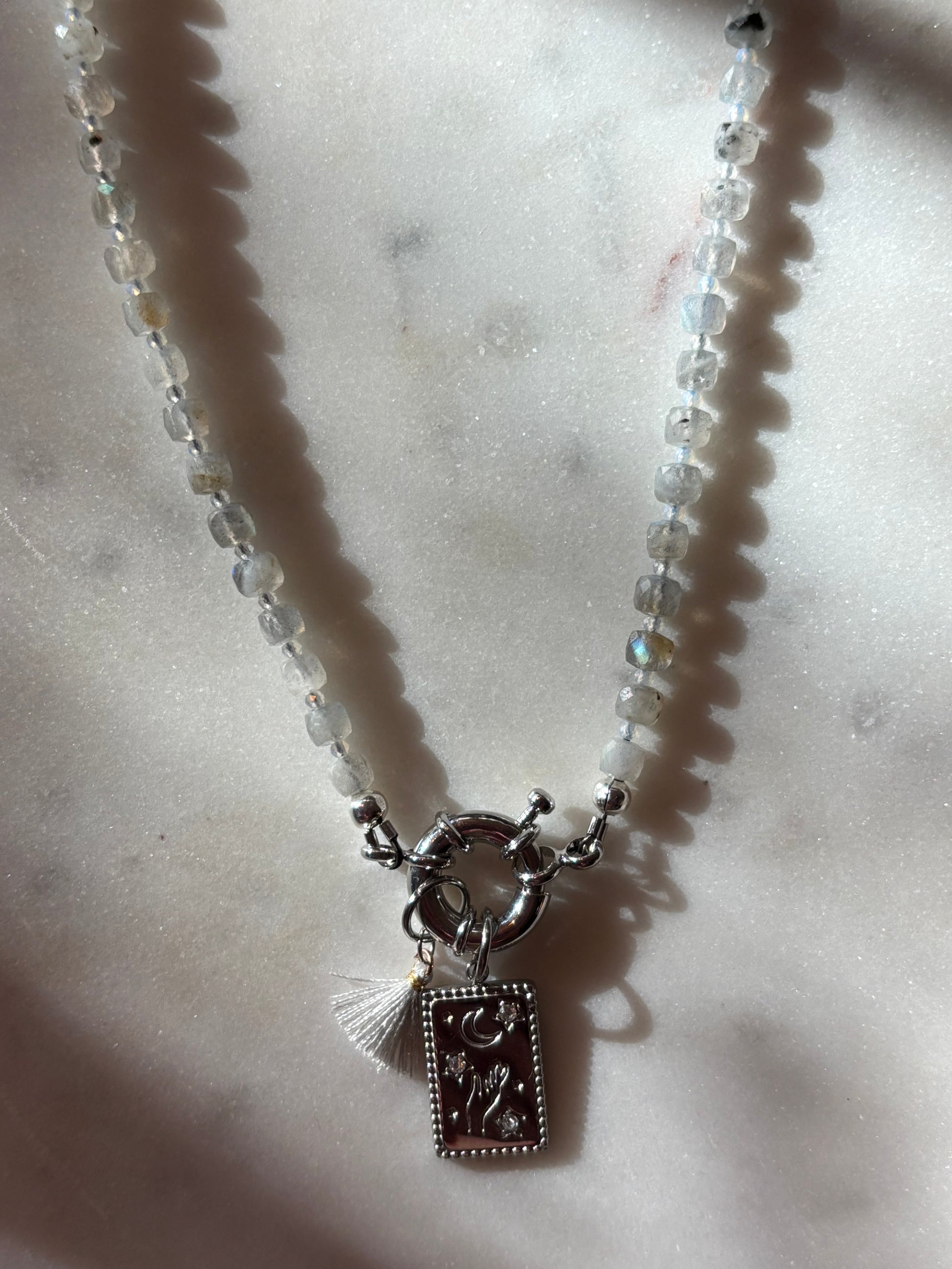 Hecho a mano con labradorita, ópalo y charms de acero inoxidable.
