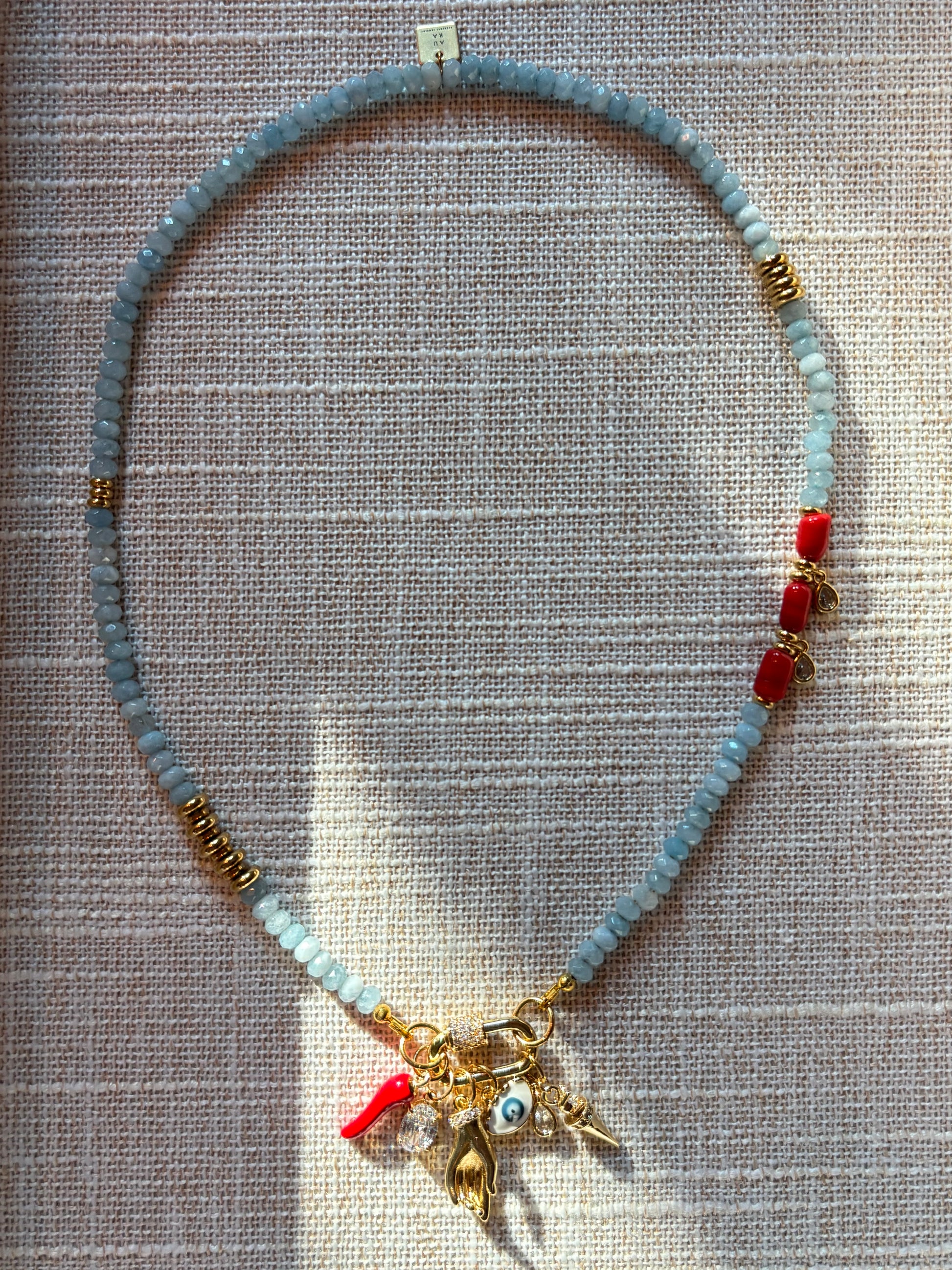 Hecho a mano con aguamarina, coral, separadoras de acero inoxidable y charms de acero inoxidable y chapa de oro.