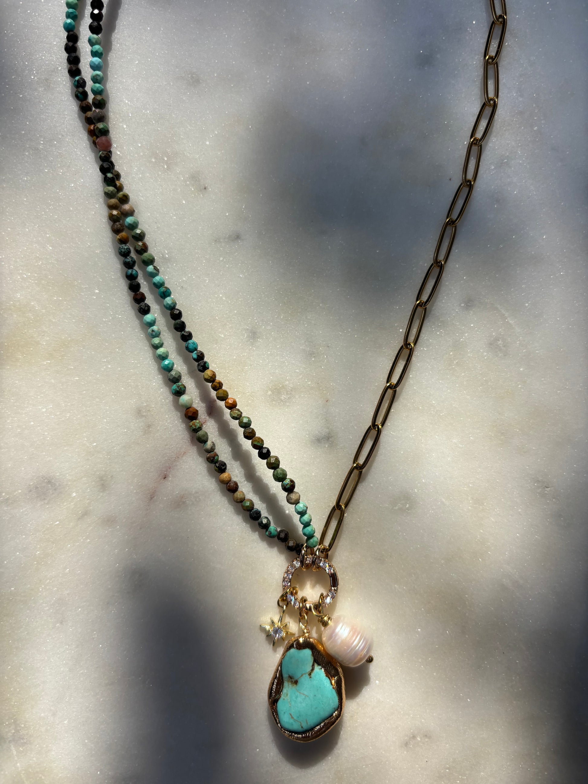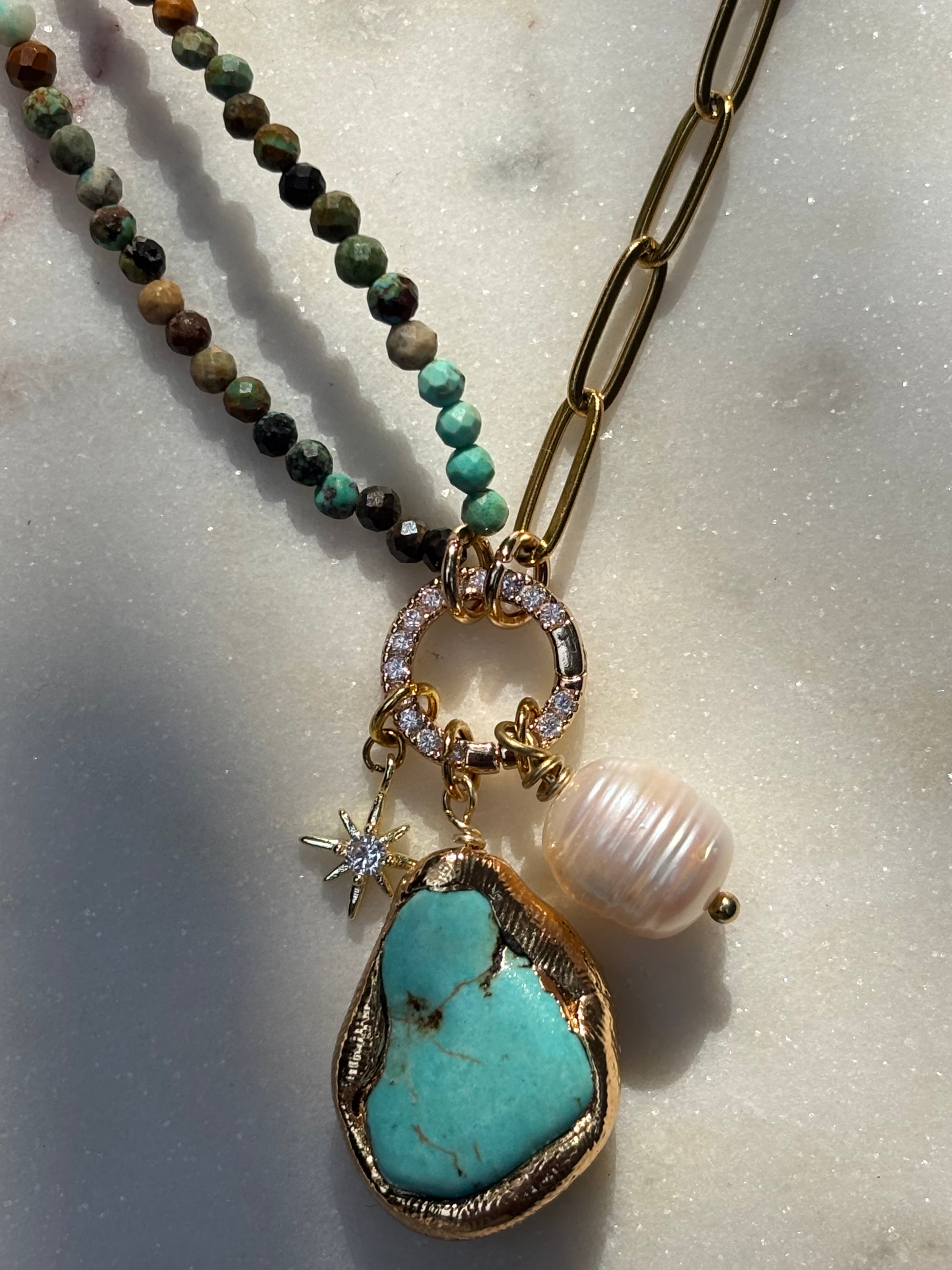 Collar hecho a mano con turquesas africanas, cadena de acero inoxidable, mosquetón con zirconias, charms en chapa de oro y perla natural.
