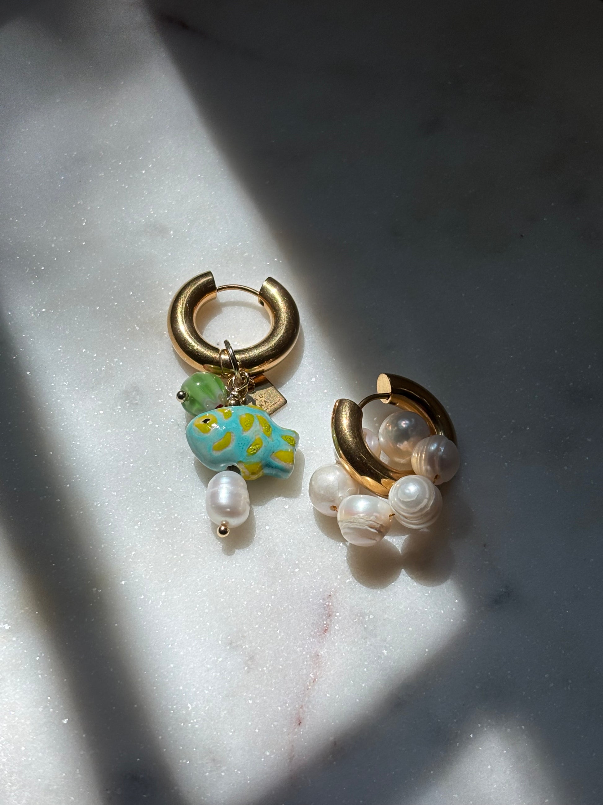 Hecho a mano, hilos de acero inoxidable, perlas naturales, charms de cerámica y beads de murano.