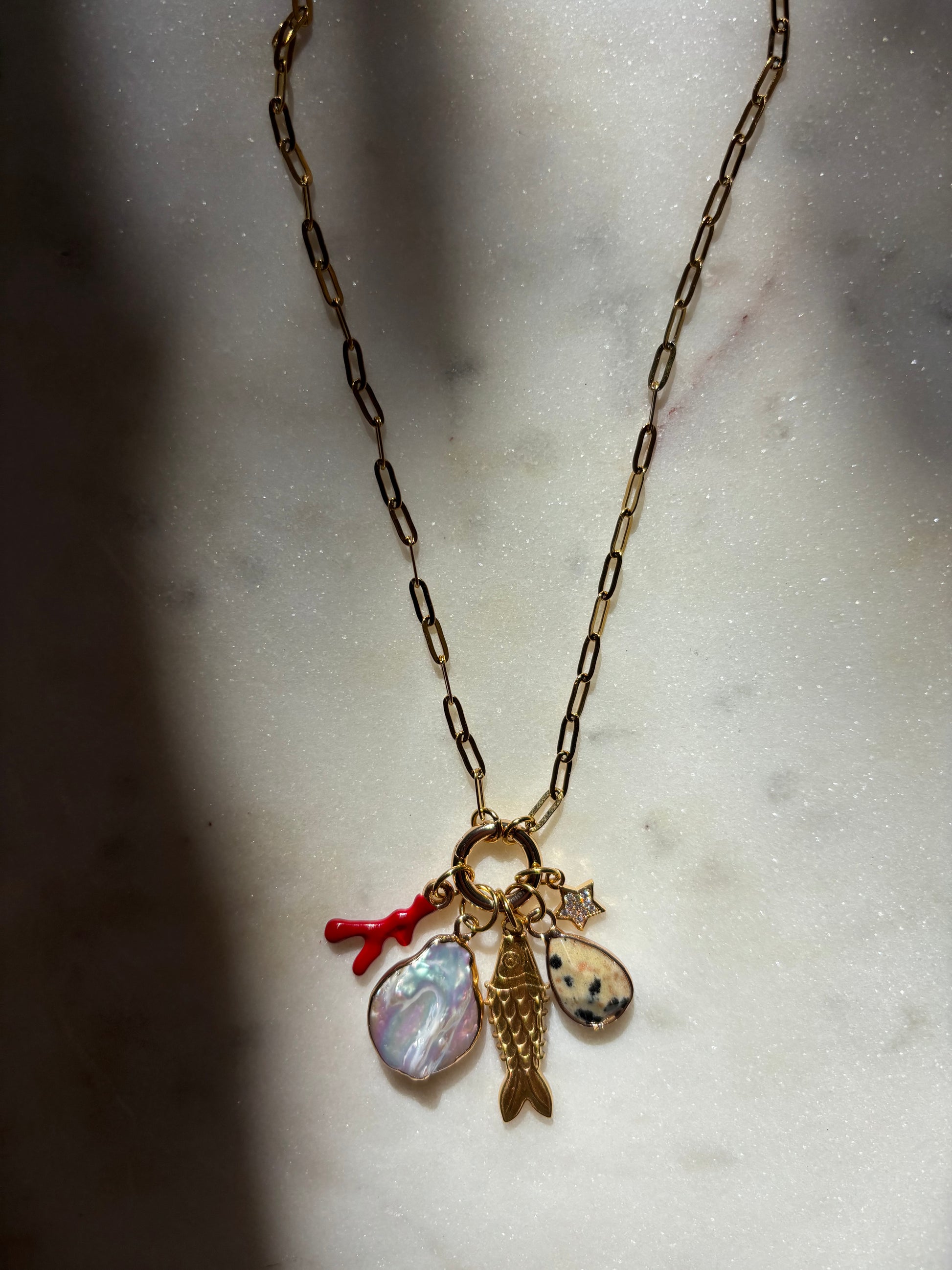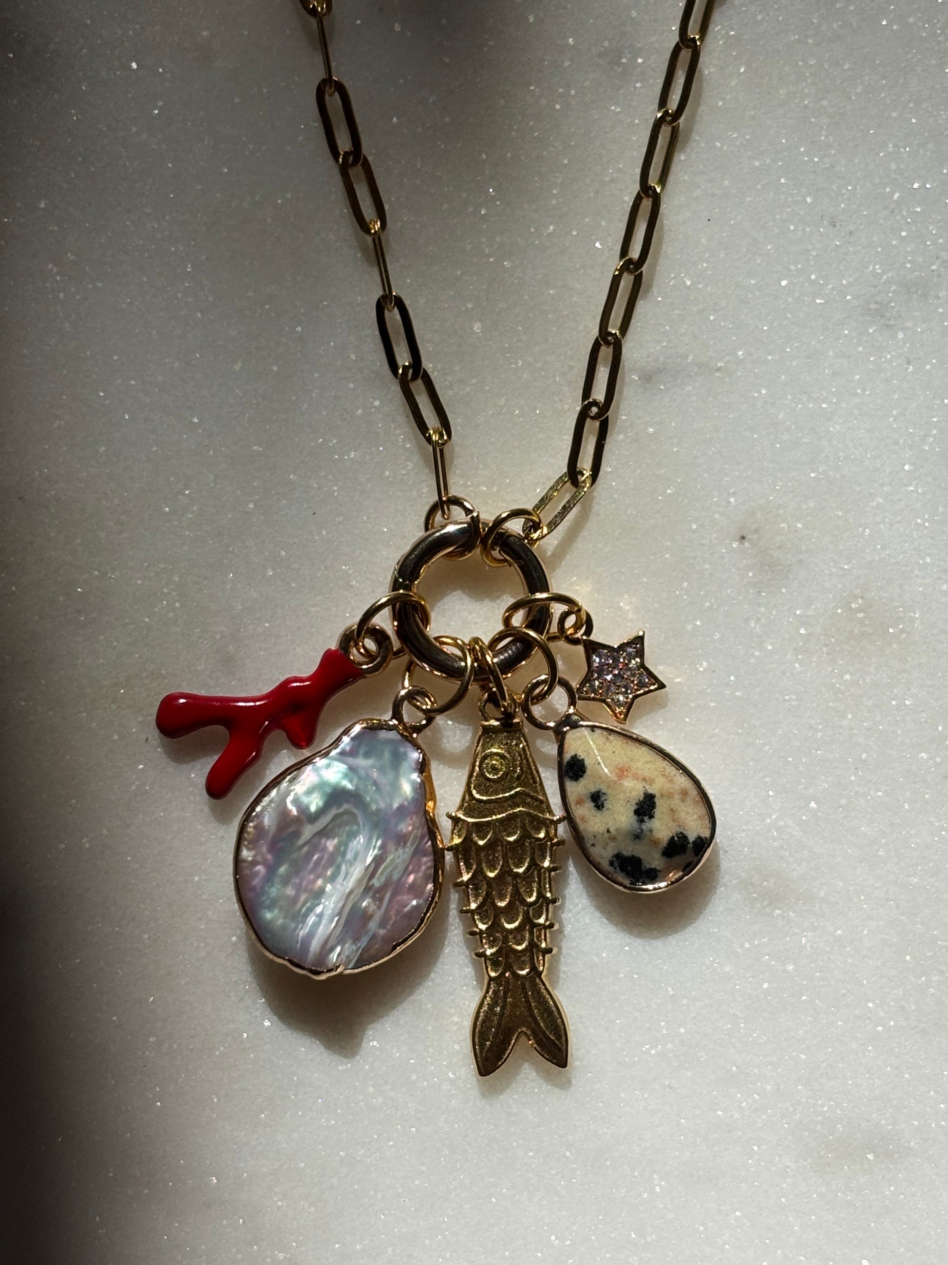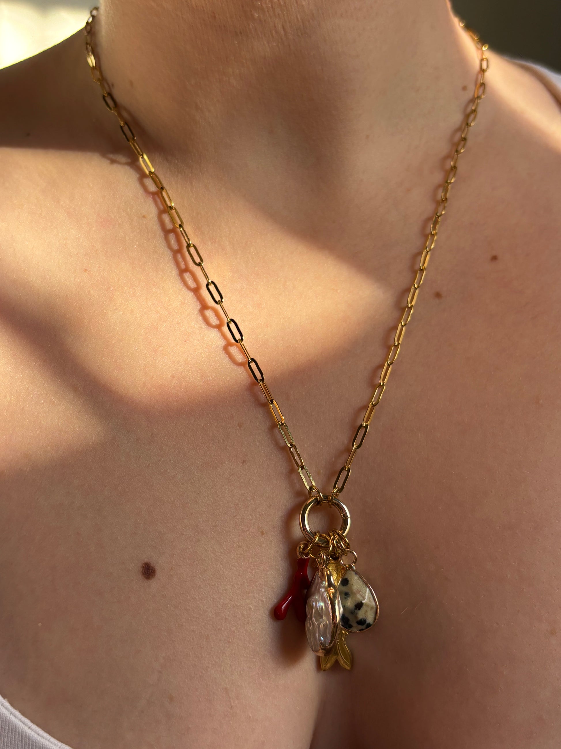 Hecho a mano con cadena de acero inoxidable con charms de acero inoxidable, perla natural, y drop de jaspe dálmata.