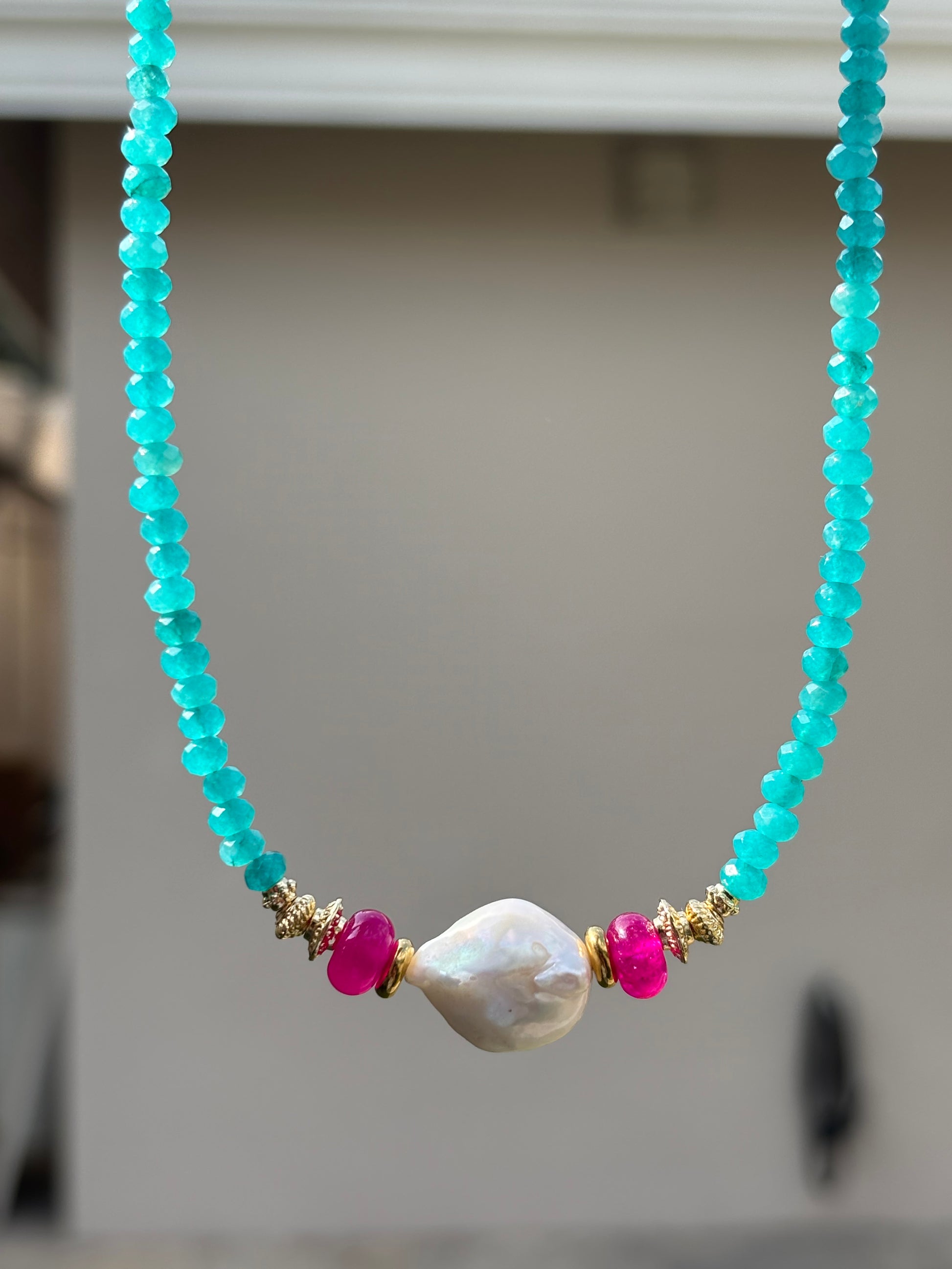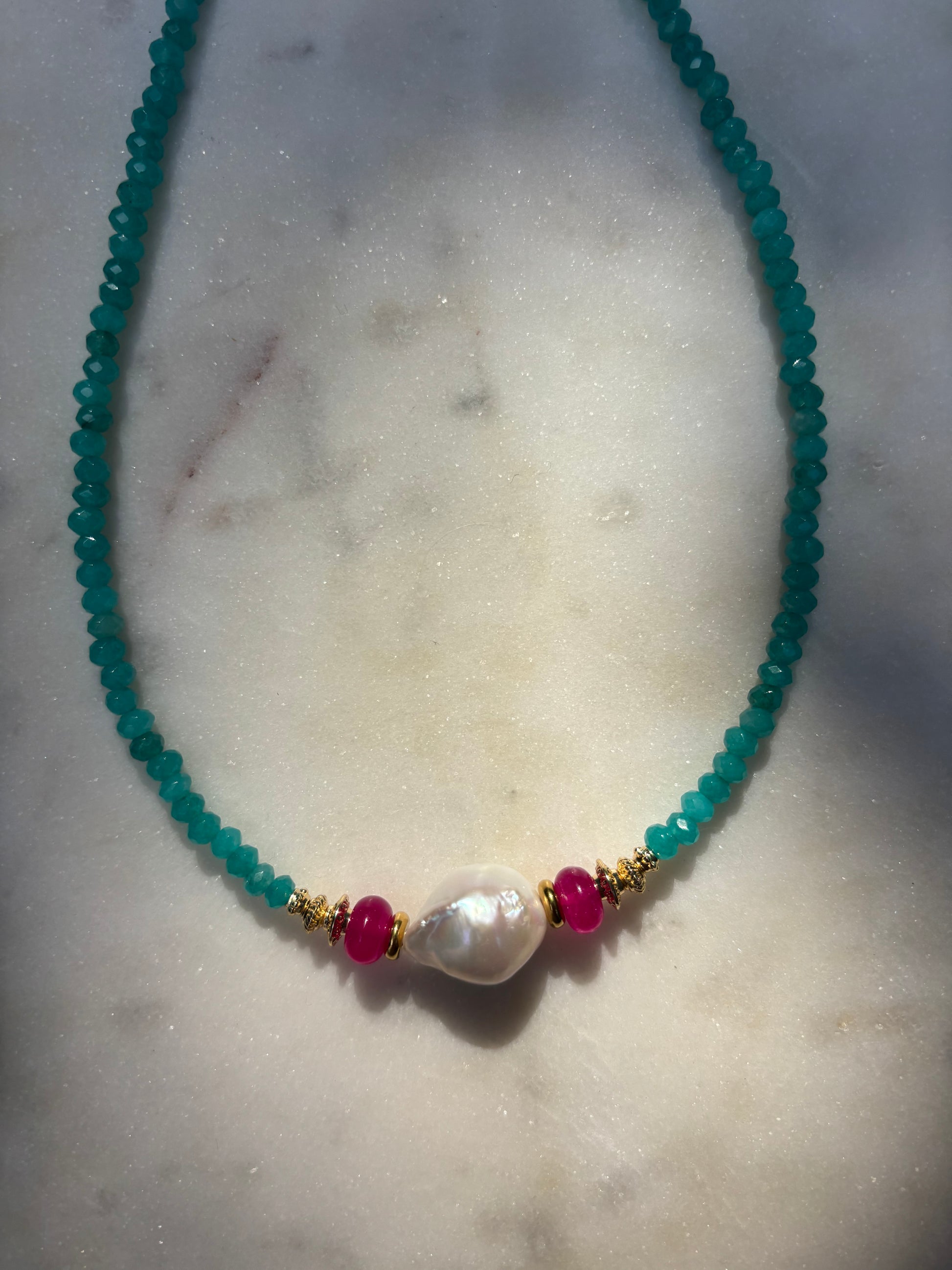 Collar hecho a mano con calcedonia natural y perla barroca.
