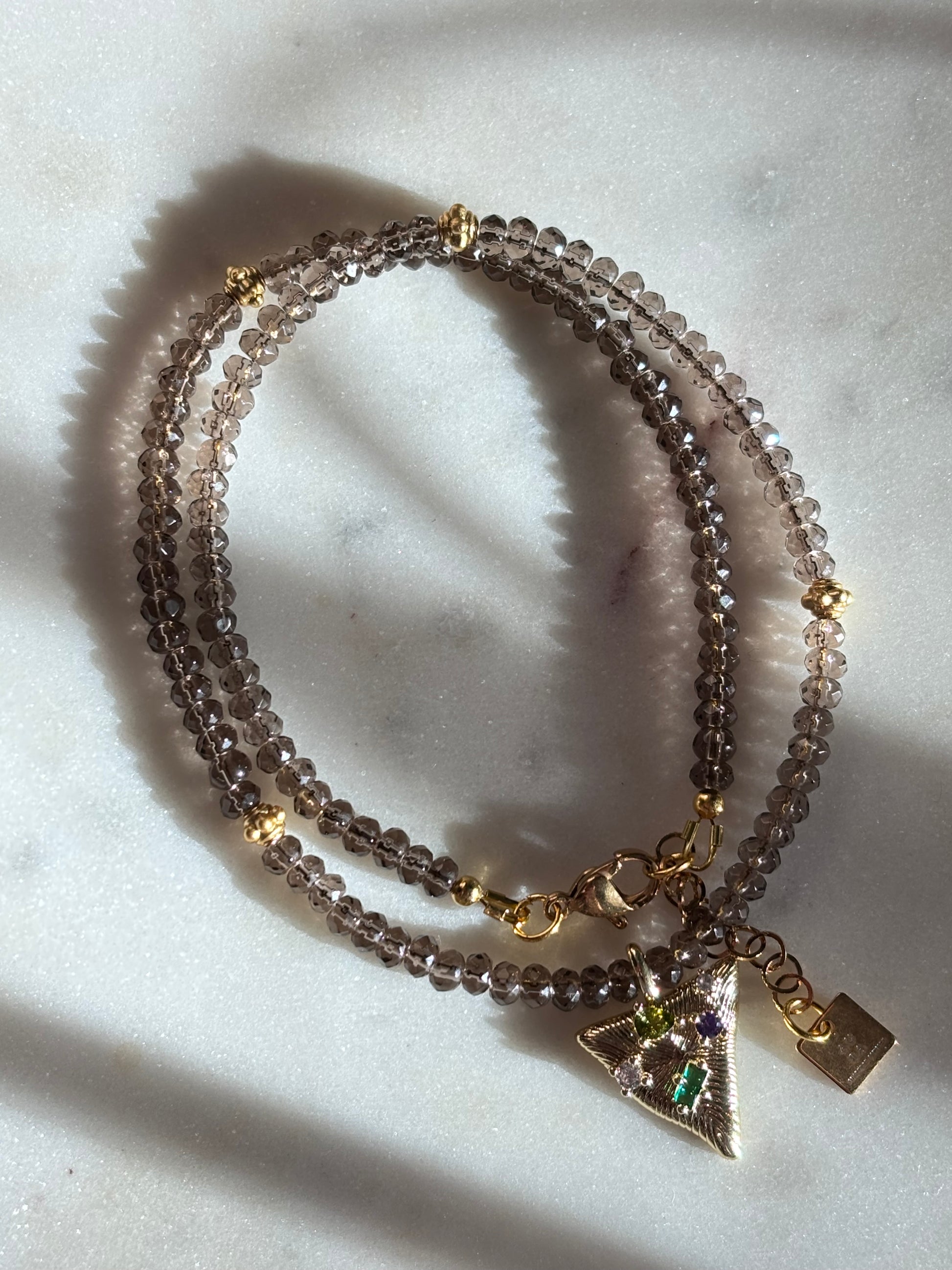 Collar hecho a mano de cuarzo ahumado 100% natural y dije chapado en oro con zirconias.