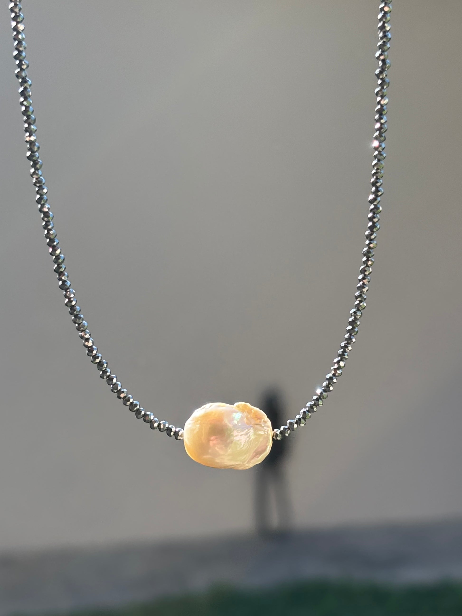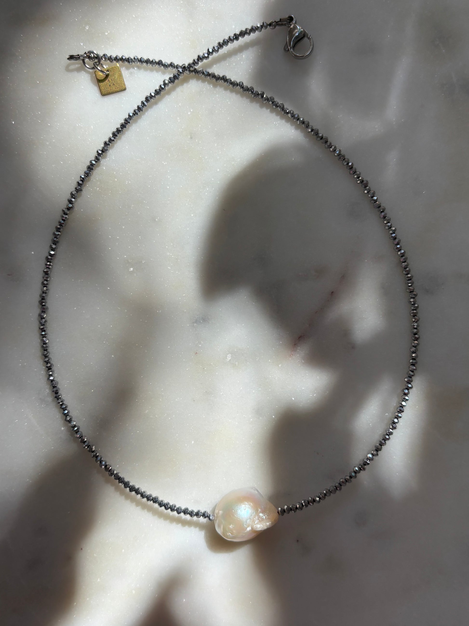 Collar hecho a mano de cristales plateados con perla barroca natural AAA