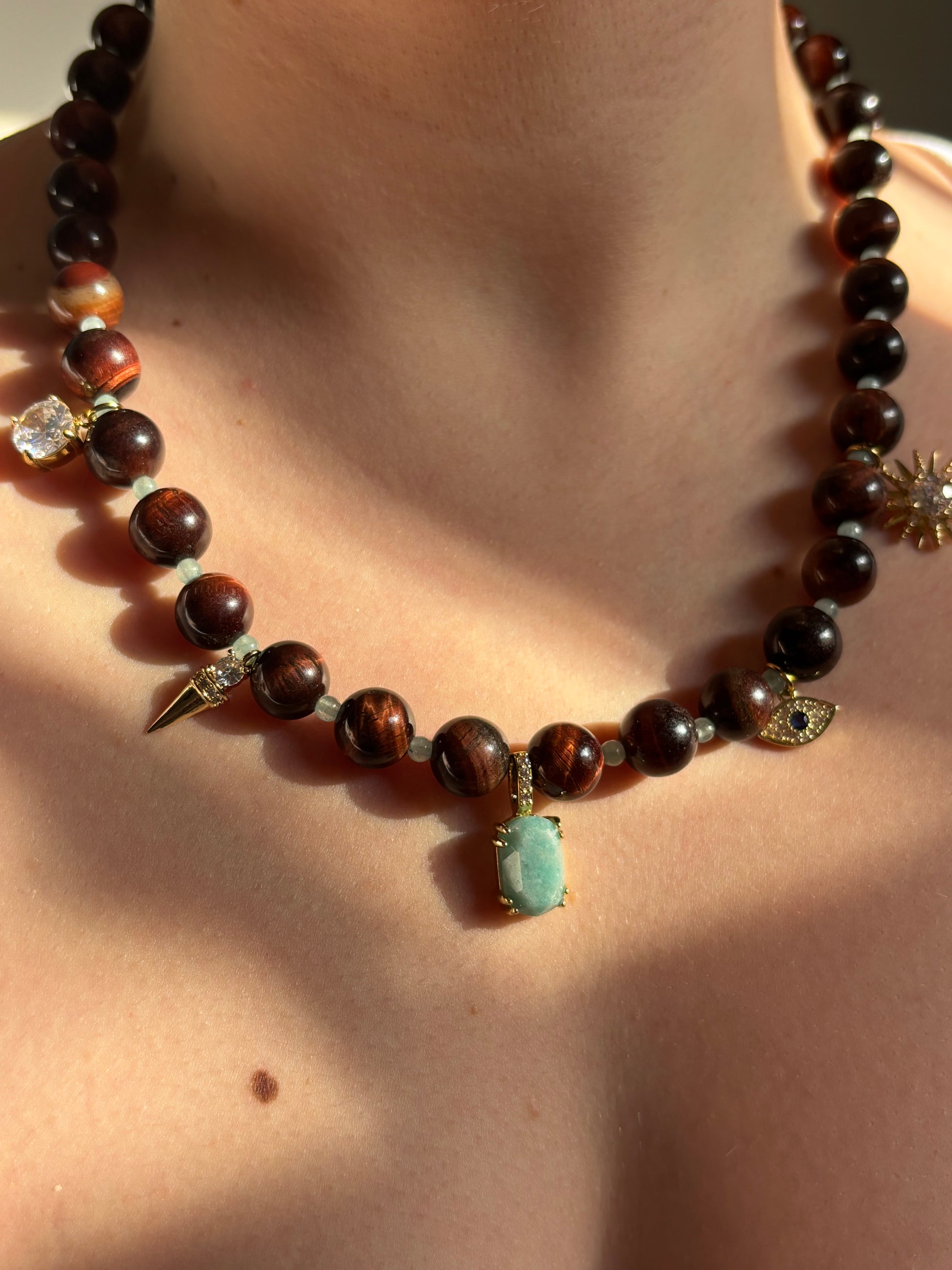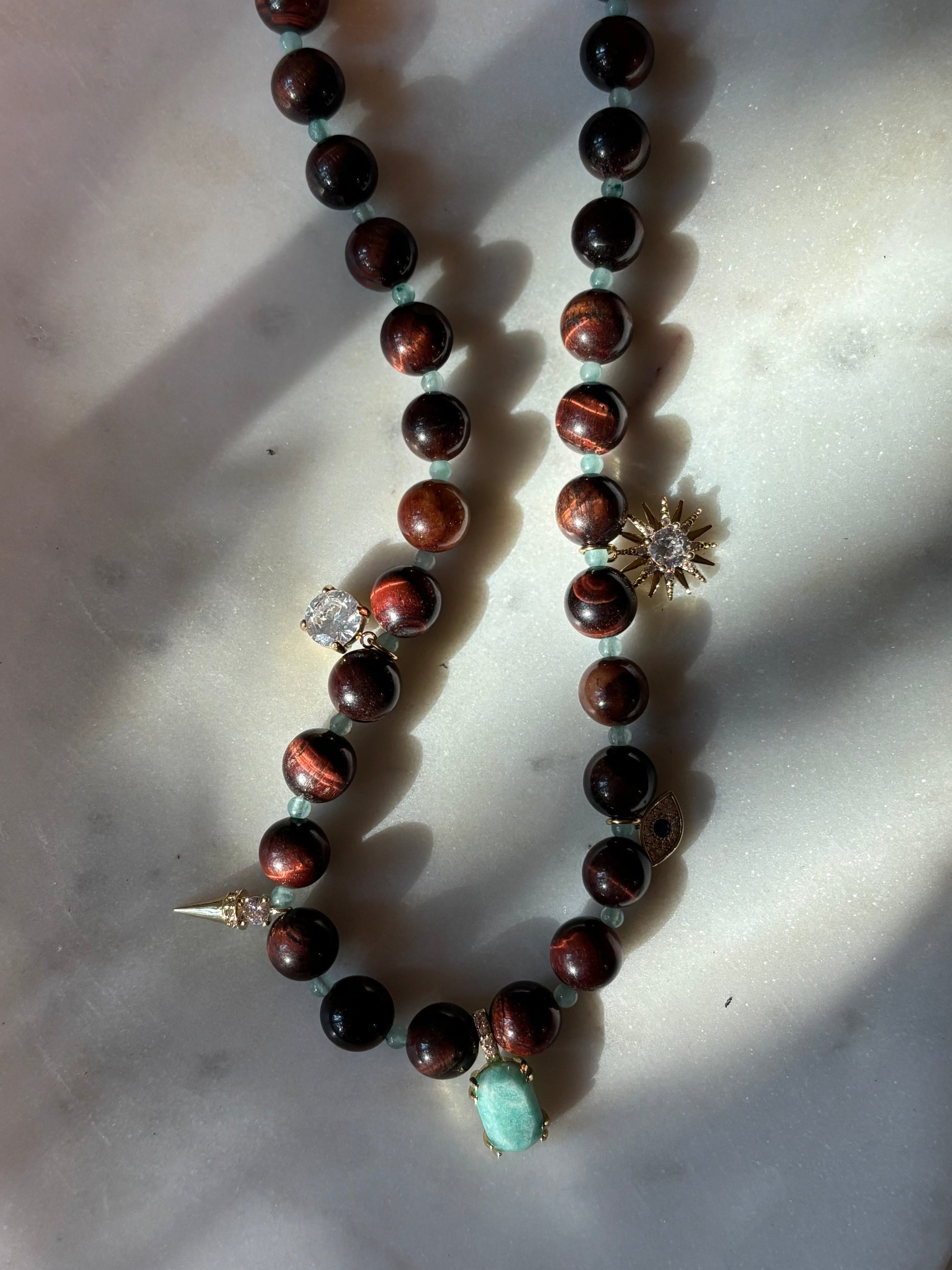 Hecho a mano con ojo de tigre rojo, apatita y charms de acero inoxidable.