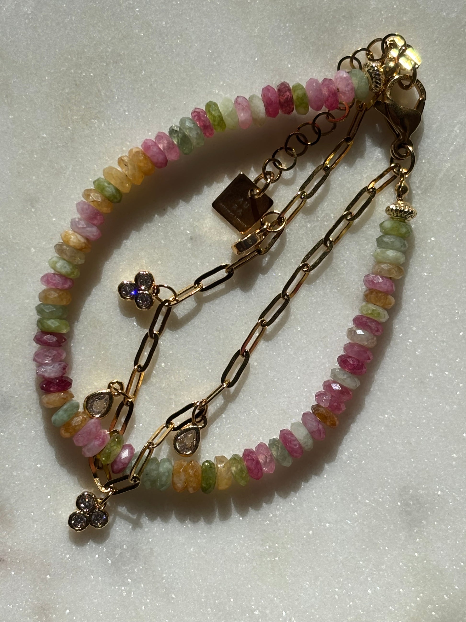 Pulsera hecha a mano con turmalina natural facetada, cadena de acero inoxidable y charms en chapa de oro con zirconias.
